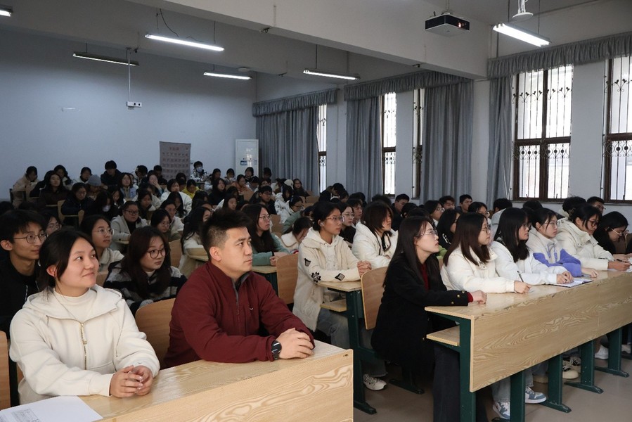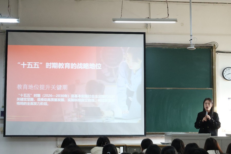 卜士浈老师以“青耘直上,青春砺能” 为主题。她从历史演变切入,重点结合“十五五”时期教育地位的战略提升,阐释二十届四中全会精神的教育实践。她强调,青年干部需兼修理论素养与实干功底,争做“有火候”的实干家;并创新阐述团学工作中的“新质生产力”,要求将政治引领与新兴事物深度融合,通过把握“一定位、两关系、四角色、五才干、六注意、七能力”,切实践行“四新一高”要求。最后,卜士浈老师勉励大家把标准转化为行动,在服务师生中练就真本领。