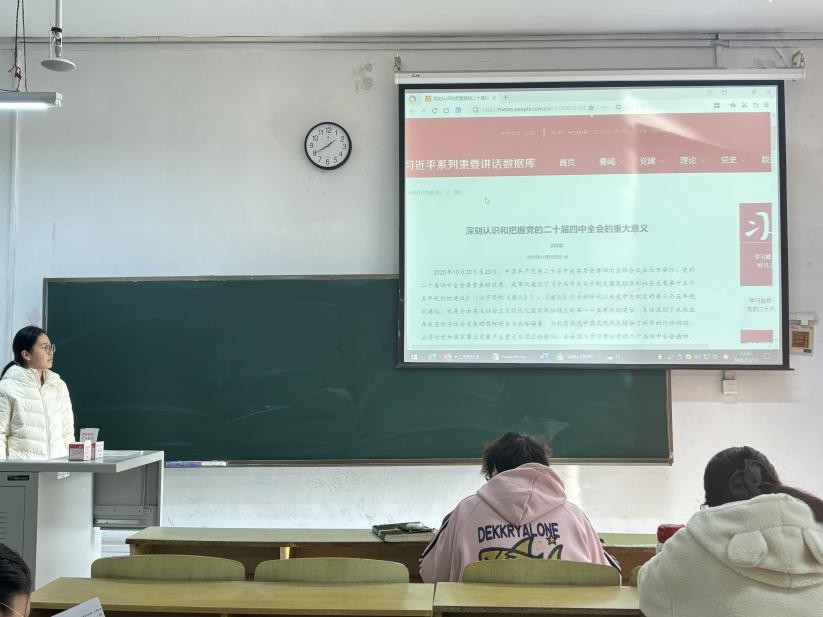 通过本次主题团日活动,同学们深入学习了党的二十届四中全会精神。大家深刻认识到,全会对推进中国式现代化作出的新部署,是强国建设、民族复兴征程上的关键指引。作为新时代青年,我们备受鼓舞,更深感责任在肩。未来,我们当深入学习贯彻党的二十届四中全会精神,认真学习领会“十五五”规划建议,锤炼过硬本领,勇担时代使命,贡献青春力量。