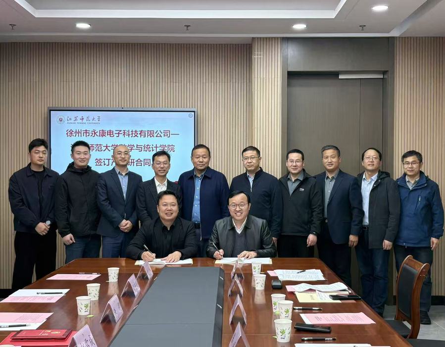 为深化产教融合、推进科教融汇,助力智慧医疗与人工智能领域创新发展,4月21日下午,数学与统计学院教师与徐州市永康电子科技有限公司横向课题签约暨江苏省产业教授聘任仪式在智华楼202会议室顺利举行。徐州市永康电子科技有限公司总经理赵雪成、江苏师范大学科学技术研究院院长马晓冬、研究生院副院长张忠启、学院党委书记周显洋、院长张超等领导出席仪式,永康电子核心团队成员参会。活动由副院长祝宝宣主持。